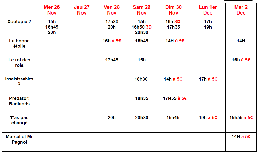 SORTIE NATIONALE MERCREDI 26 NOVEMBRE 15H – 16H45 – 20H