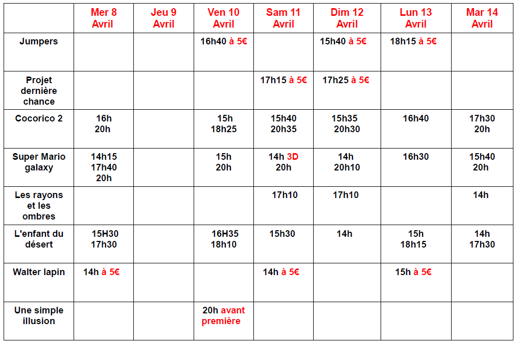 A PARTIR DU MERCREDI 8 AVRIL 14H A 5€